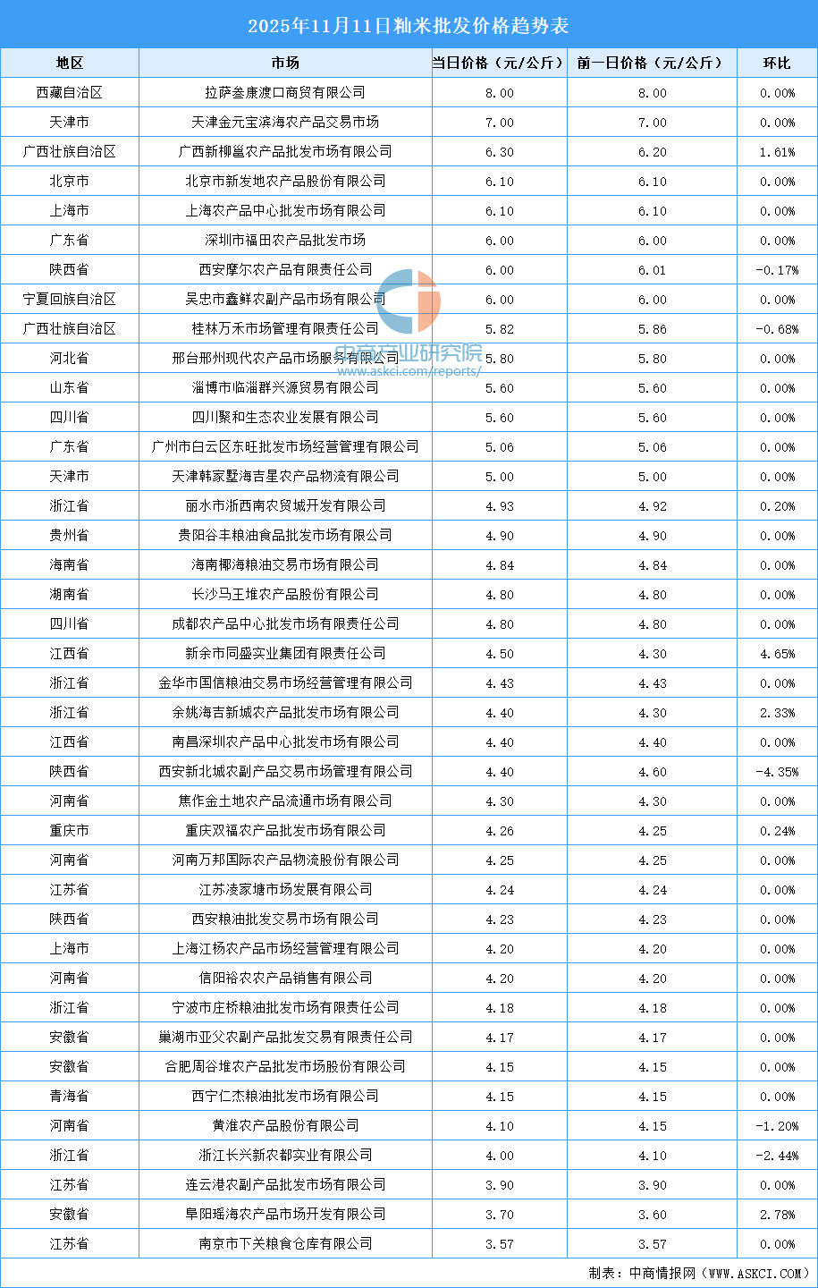 中商情報網(wǎng)訊:最新數(shù)據(jù)顯示:11月11日,全國粳米當日均價為5.23元/公斤,秈米當日均價4.91元/公斤。其中,粳米價格最高的遵義金土地綠色產(chǎn)品交易有限公司,當日價格為7.90元/公斤,環(huán)比持平。秈米價格最高的市場是拉薩叁康渡口商貿(mào)有限公司,當日價格為8.00元/公斤,環(huán)比持平。以下是2025年11月11日全國大米價格趨勢表詳情: