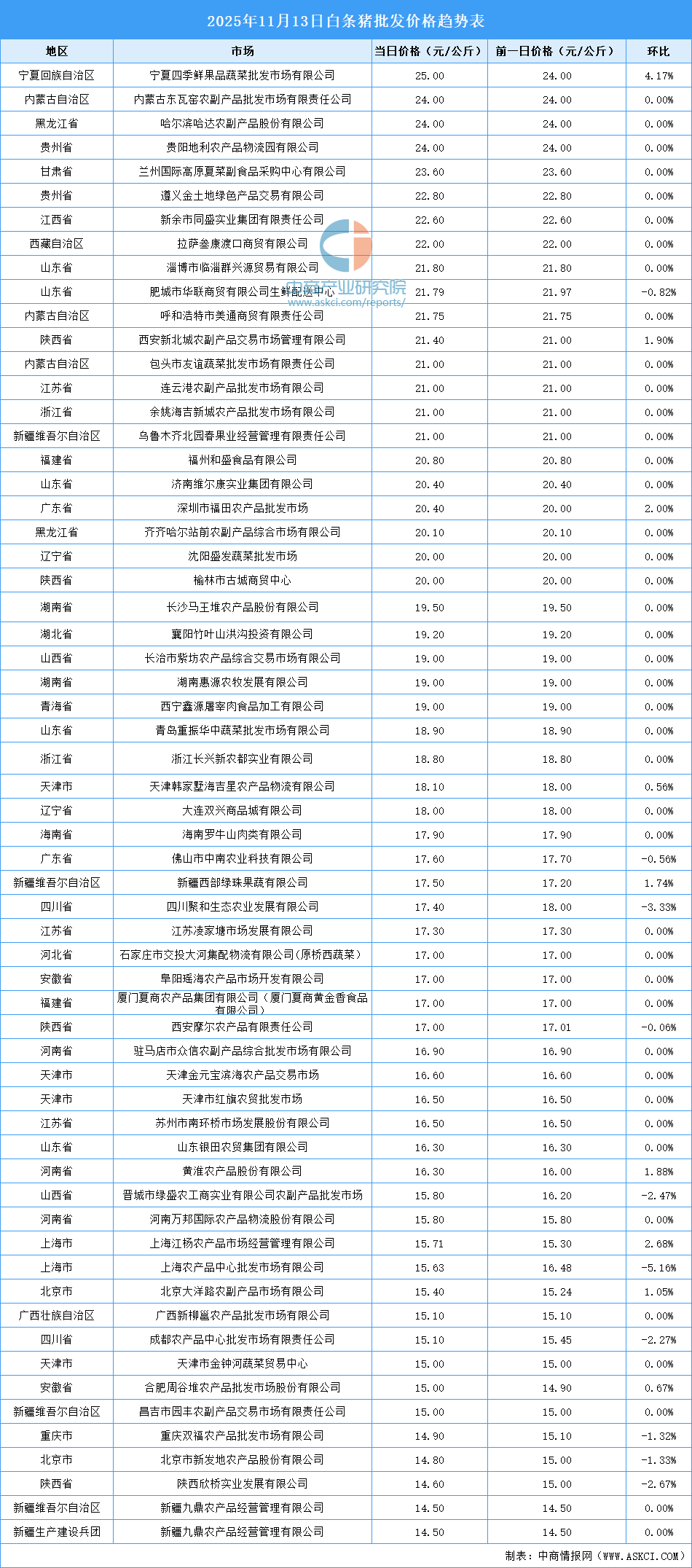 中商情報網(wǎng)訊:最新數(shù)據(jù)顯示:11月13日全國白條豬平均價格為18.55元/公斤。其中,白條豬價格最高的市場是寧夏四季鮮果品蔬菜批發(fā)市場有限公司,當(dāng)日價格為25.00元/公斤,環(huán)比上漲4.17%。白條豬價格最低的是新疆九鼎農(nóng)產(chǎn)品經(jīng)營管理有限公司,當(dāng)日價格為14.50元/公斤,環(huán)比持平。