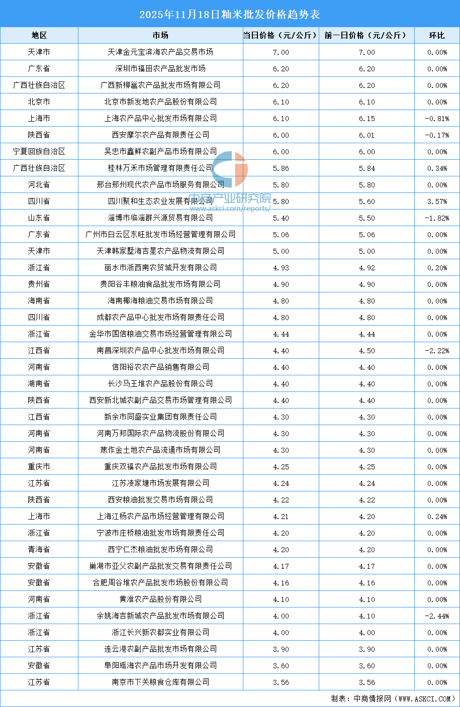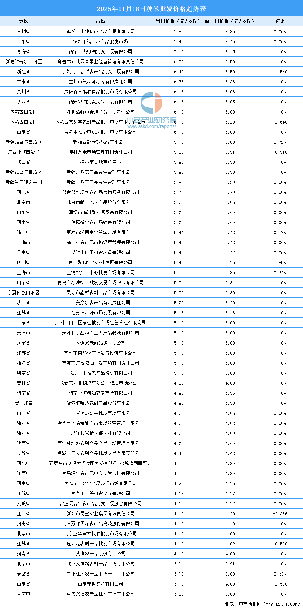中商情報(bào)網(wǎng)訊:最新數(shù)據(jù)顯示:11月18日,全國(guó)粳米當(dāng)日均價(jià)為5.19元/公斤,秈米當(dāng)日均價(jià)4.81元/公斤。其中,粳米價(jià)格最高的遵義金土地綠色產(chǎn)品交易有限公司,當(dāng)日價(jià)格為7.80元/公斤,環(huán)比持平。秈米價(jià)格最高的市場(chǎng)是天津金元寶濱海農(nóng)產(chǎn)品交易市場(chǎng),當(dāng)日價(jià)格為7.00元/公斤,環(huán)比持平。以下是2025年11月18日全國(guó)大米價(jià)格趨勢(shì)表詳情: