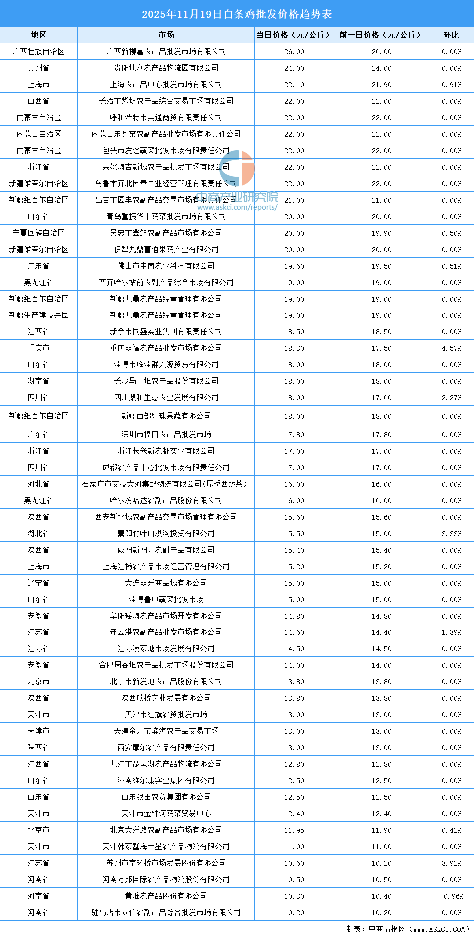 中商情報(bào)網(wǎng)訊:最新數(shù)據(jù)顯示:11月19日全國白條雞平均價(jià)格為16.70元/公斤。其中,白條雞價(jià)格最高的市場是廣西新柳邕農(nóng)產(chǎn)品批發(fā)市場有限公司,當(dāng)日價(jià)格為26.00元/公斤,環(huán)比持平。白條雞價(jià)格最低的市場是駐馬店市眾信農(nóng)副產(chǎn)品綜合批發(fā)市場有限公司,當(dāng)日價(jià)格為10.20元/公斤,環(huán)比持平。