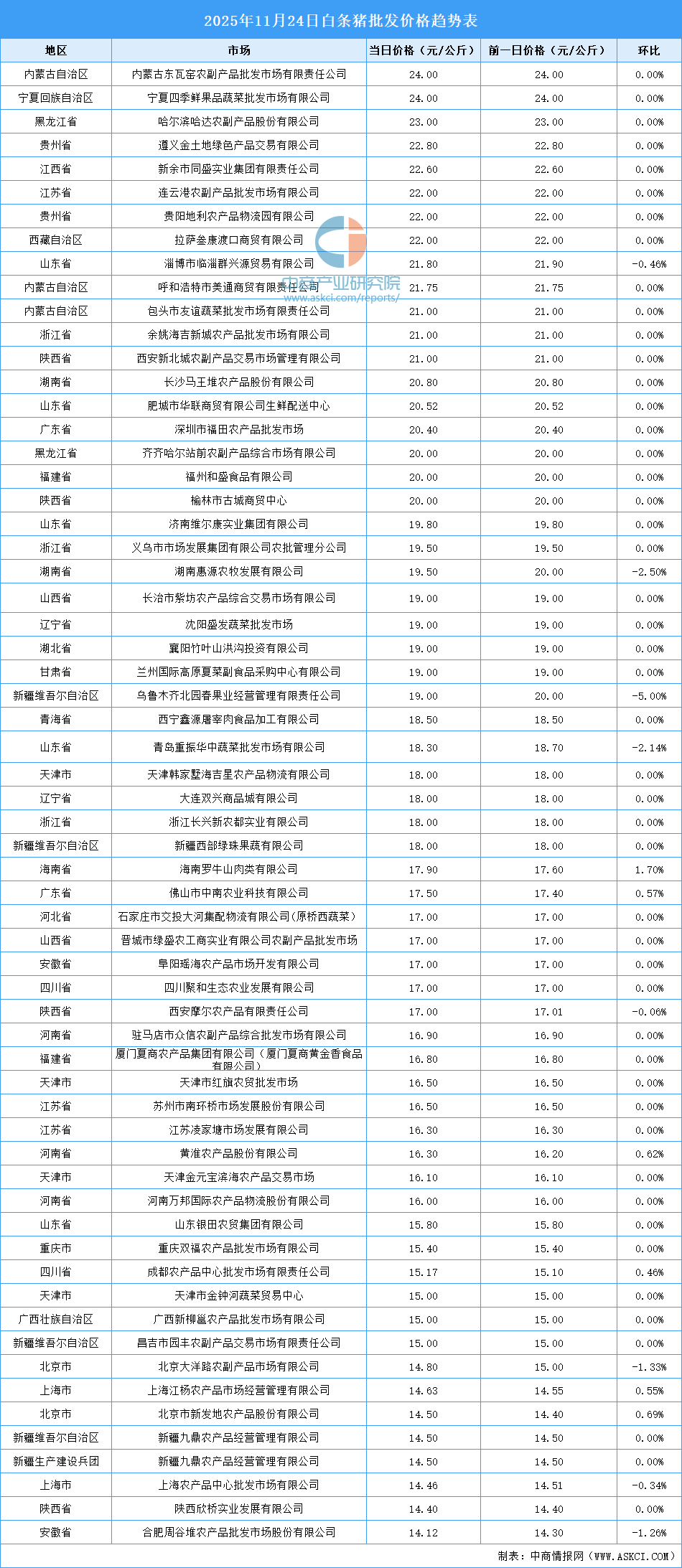 中商情報(bào)網(wǎng)訊:最新數(shù)據(jù)顯示:11月24日全國(guó)白條豬平均價(jià)格為18.26元/公斤。其中,白條豬價(jià)格最高的市場(chǎng)是內(nèi)蒙古東瓦窯農(nóng)副產(chǎn)品批發(fā)市場(chǎng)有限責(zé)任公司、寧夏四季鮮果品蔬菜批發(fā)市場(chǎng)有限公司,當(dāng)日價(jià)格均為24.00元/公斤。白條豬價(jià)格最低的是合肥周谷堆農(nóng)產(chǎn)品批發(fā)市場(chǎng)股份有限公司,當(dāng)日價(jià)格為14.12元/公斤,環(huán)比下跌1.26%。